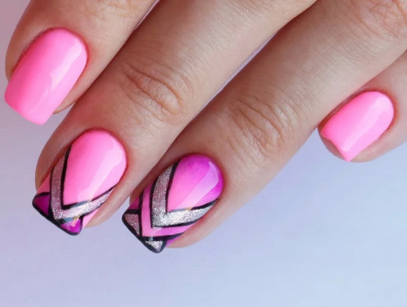 Evening bows should be elegant, so for special manicures in pink colors you can use a different sparkling decor. However, you should immediately make a reservation: you will have to use it in doses so as not to look tasteless and vulgar. The leading position in the design of the figure will take patterns using dots, lines and various geometric shapes. For summer bows, it is necessary to choose drawings with floral themes, plants, abstract and ethnic motifs. Consider the main trends in the decoration of nails in the upcoming season.