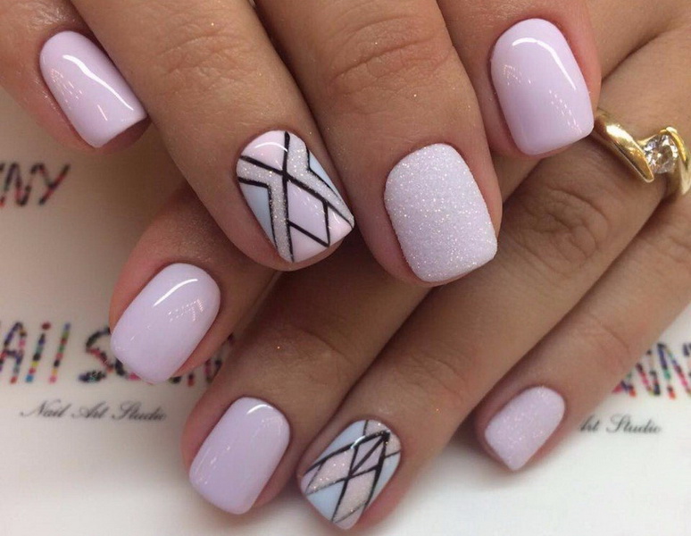 Geometry will be a popular design classic for all seasons. Moreover, it is allowed not only to design nails with geometric figures, but also to draw various straight lines with the location of points on them, as well as various hollow triangles, prisms, and complex designs from lines superimposed on one another. For winter bows it is worth picking up patterns of frosty patterns, they can be made using white contrast of lace and silvering.