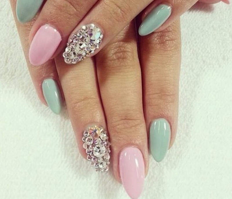 Despite the tendency of fashionable tendencies to minimalism and lightness, the new season will not do without sparkling stones and rhinestones. However, everything should be in moderation, on which the emphasis is on new trends. For example, you can not decorate all the nails in bulk rhinestones or stones, but you can choose accents as a basis for decorating. Monochrome manicure can be decorated with accentuation of the cuticle area, using small rhinestones.