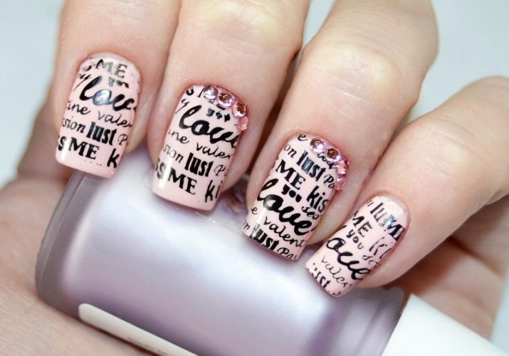 Admirers of vintage designs will like nail design using newspaper manicure.Printed letters will look stylish and unusual on a gentle pink background. In addition, the newspaper manicure in pink colors provides for the further decoration of the nail plates. This can be done with different sliders or small stickers.