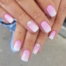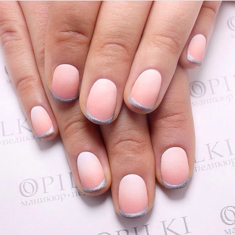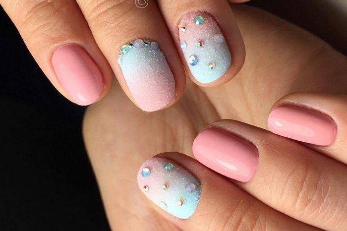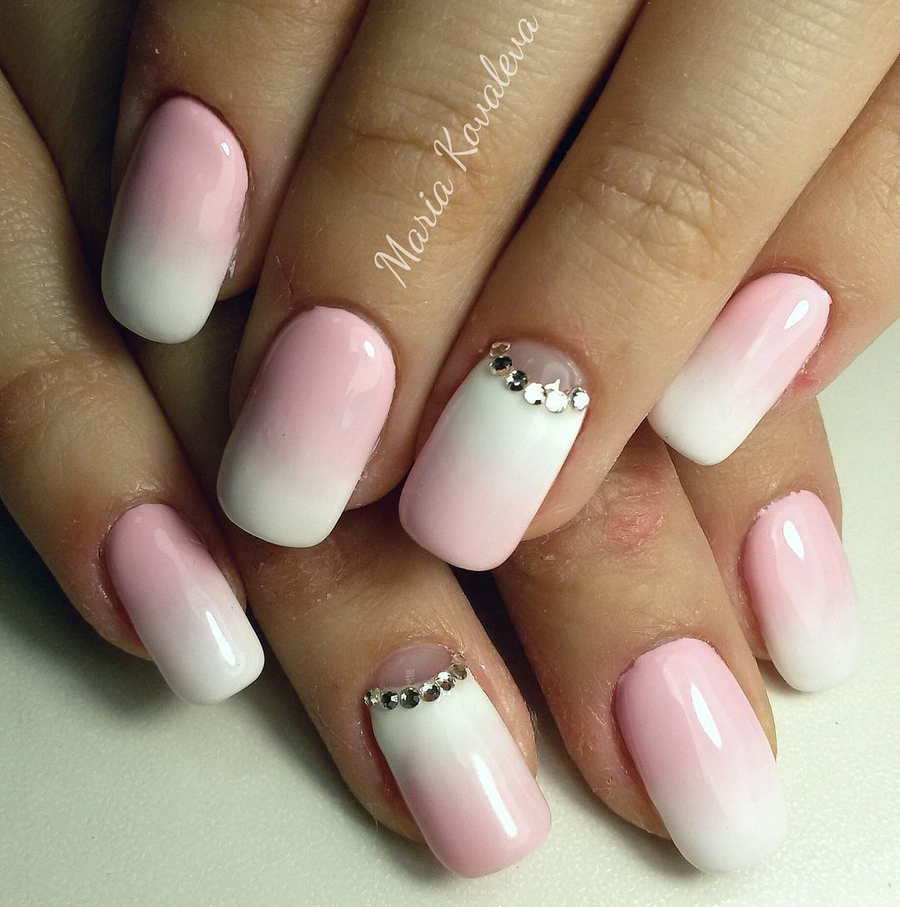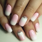 Gradient french became in demand in 2017 and still does not lose relevance. The “tandem” of pink pastel and white stripes is considered a classic, a smooth transition to which is carried out with the addition of curious textures (rhinestone, sparkles, glitter, etc.).
