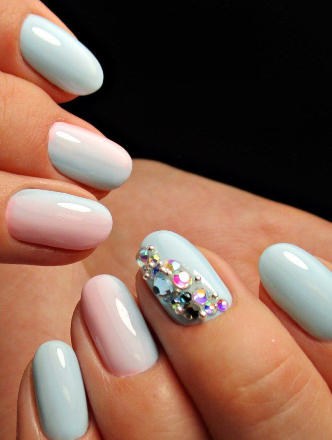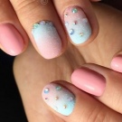 It is necessary to get rid of excess varnish with the help of a special liquid and a cotton pad (stick). The result is fixed clear varnish. Further, the ombre is decorated with rhinestones, glitter, painting, etc.