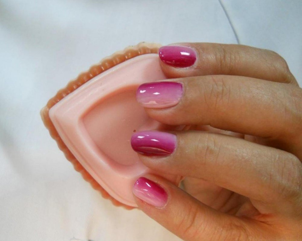 “Decorated” sponge is first imprinted on a white sheet to achieve smoother borders between colors, and then transferred to the nail. The porous structure of the sponge, the more noticeable it will be on the fingers.