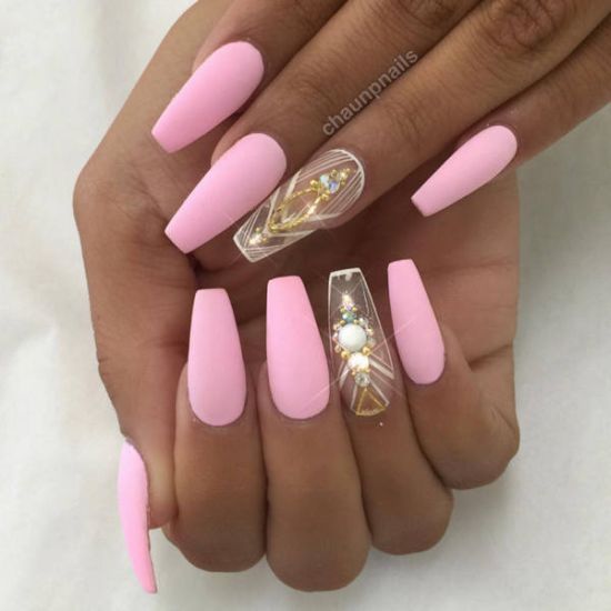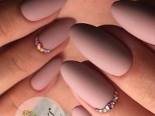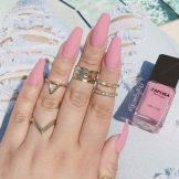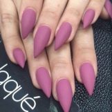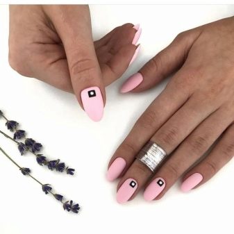 Matte color is good for nails of different shapes. Pink symbolizes tenderness, and therefore the form in this case should be appropriate. It looks great pink color on straight and oval nails. Such a manicure will look good on almond-shaped marigolds, which are becoming popular again today. But the clear claws of sharp form and great length are taboo for pink design.