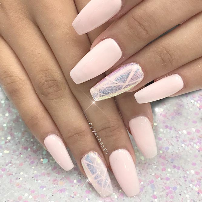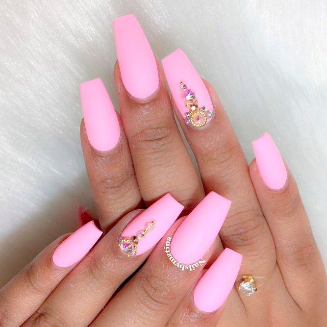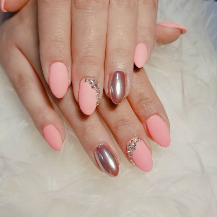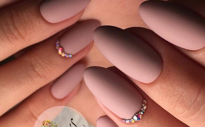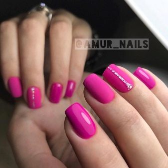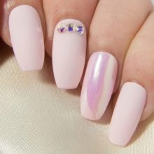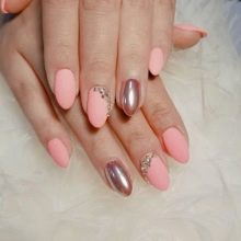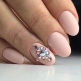 A harmonious combination of matte texture and sparkling decor. If the mix with gloss can seem vulgar and tasteless, a duet of velvety pink varnish with small rhinestones will give you luxury and aesthetics. Of course, large and large crystals are not suitable for pink, but the appropriate and metered placement of accents in the form of small pebbles will allow to add expressiveness and delicate taste to the design.