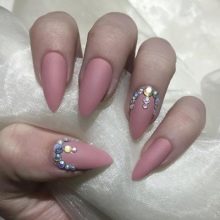 There are many ideas for decorating pink matte manicure. For example, if a design with a pattern is chosen as a basis, you can add accent with rhinestones. Even a painted feather on the accent nail, decorated with a single small rhinestone, will bring expressiveness to a matte manicure.