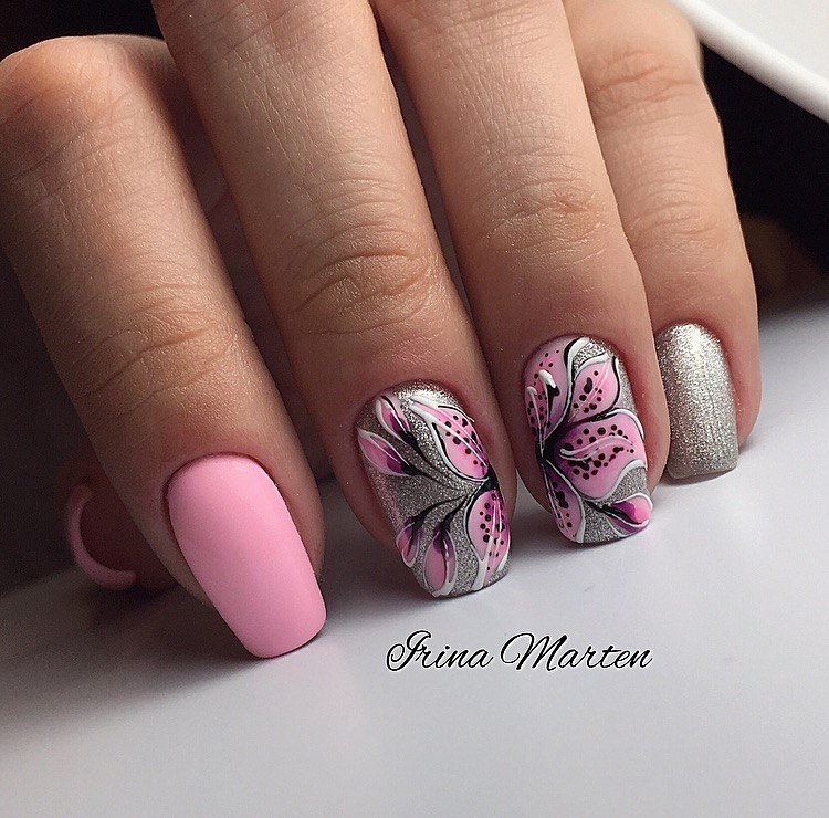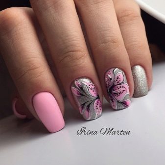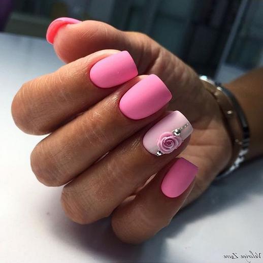 When choosing a design with a matte texture, you must consider the degree of saturation of the tone used. For example, hot pink colors are good for vacation and relaxation. For everyday images, you must select muted or light, pale pink shades of pink varnish. Pink-gray contrasts with a light gray tone are good in this case.
