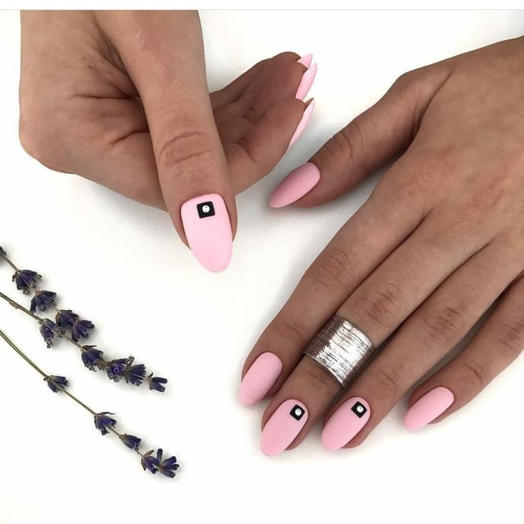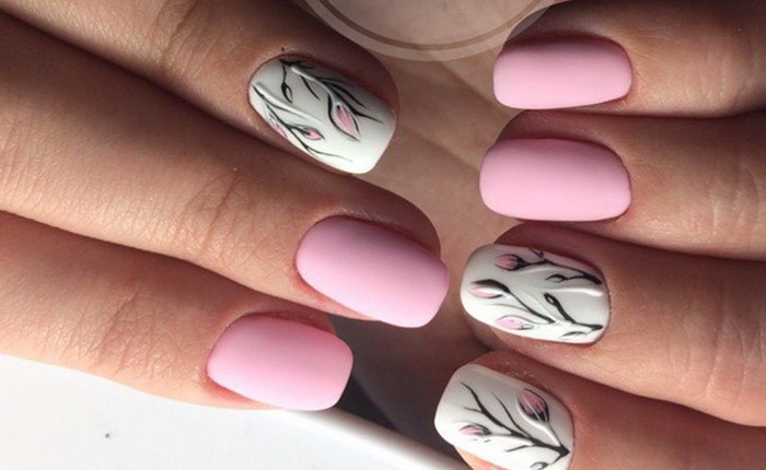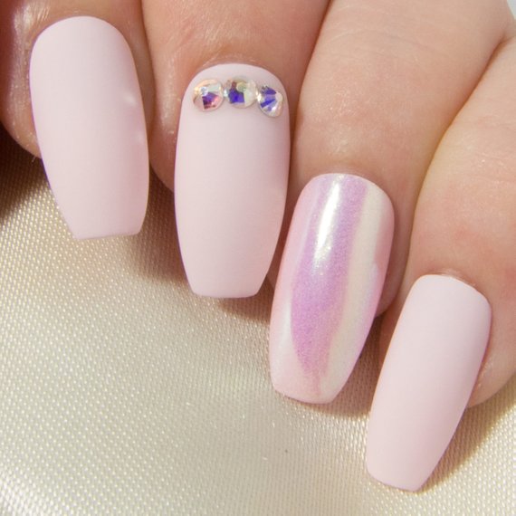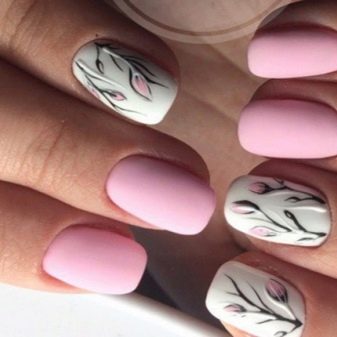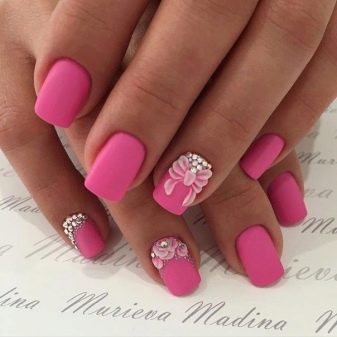 Matte design options in which one or several fingers have an accent design look gorgeous. For example, pink matte manicure can be decorated: