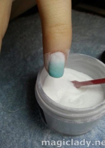 There is another way to matting varnish. For giving of the beautiful invoice use so-called dust or one more type of powder. As well as acrylic powder, it is economical and may have different tones of the color palette. However, it is not sprinkled on a sticky top, and distribute the brush, then dried in the lamp.