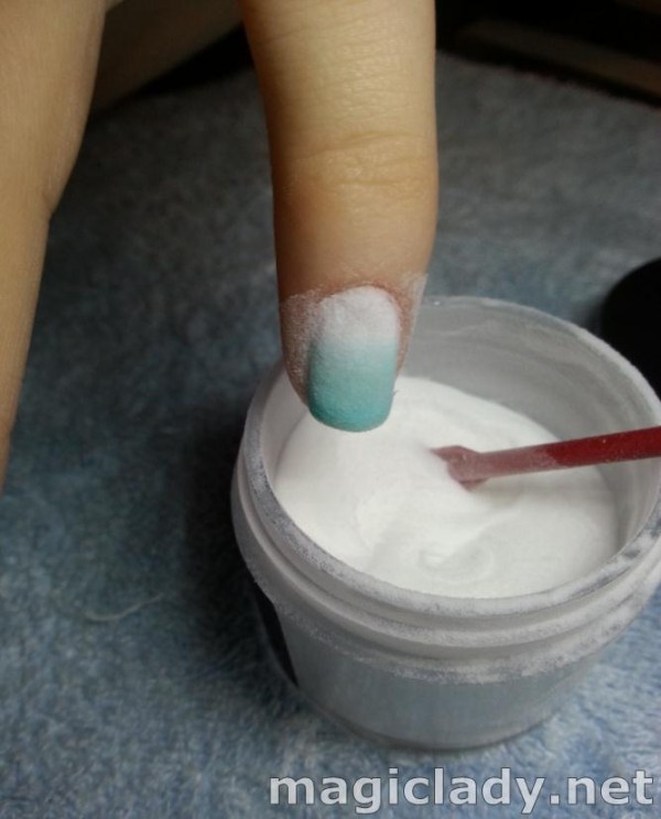 To get an unusual textured effect, it is sprinkled on top, after which the nails are dried under the lamp. The remains of powder clean brush.