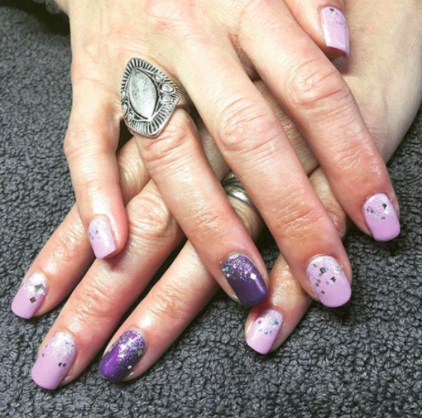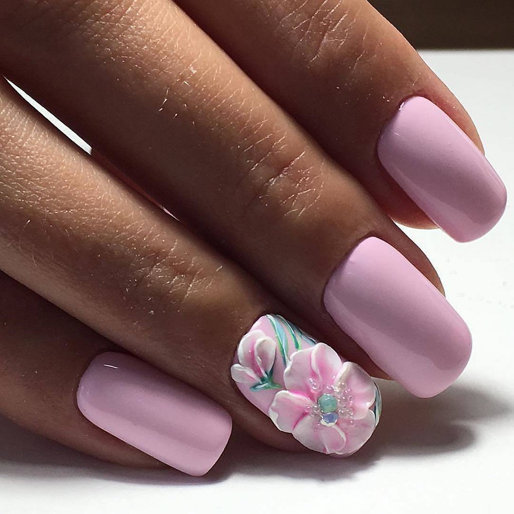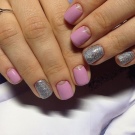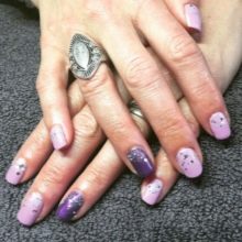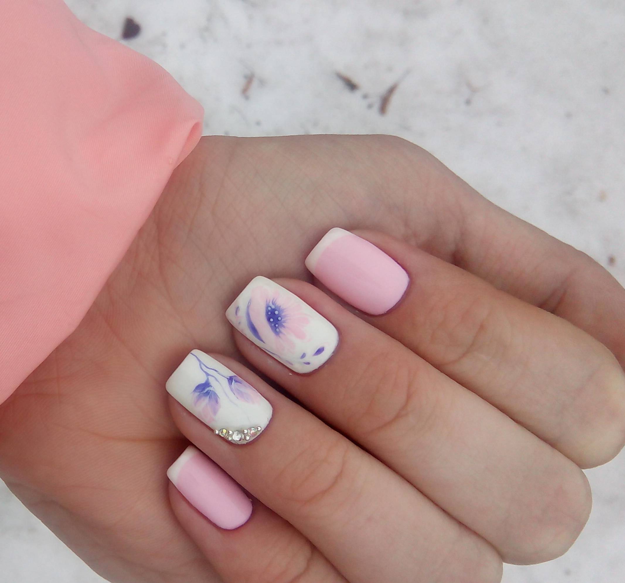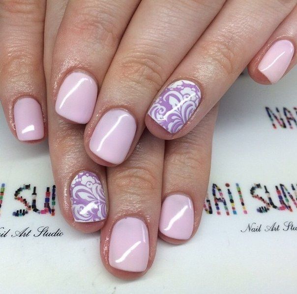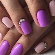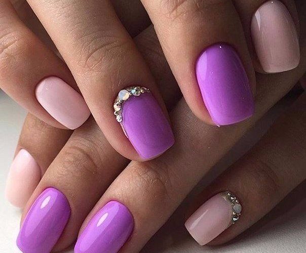 - With purple. These colors are almost the same color. Some shades of pink have a purple subtone, so combining them is very easy. This manicure is perfect for spring and summer. Gentle divorces or beautiful flowers will refresh the image. If this is a festive option, then you can add shine in the form of rhinestones.