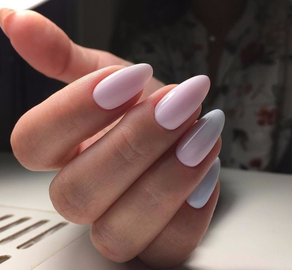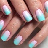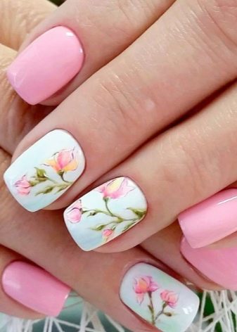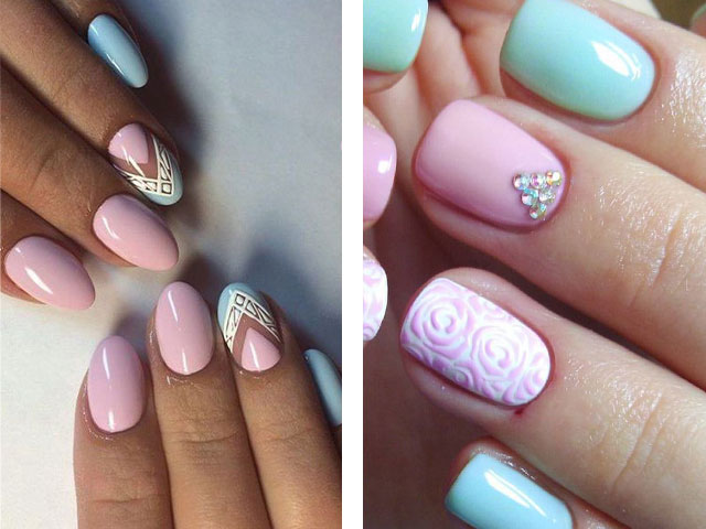 - With blue. Two gentle shades just can not be friends. Their combination resembles youth, freshness and lightness. Remember how beautiful pink clouds look in the rays of a sunset against a blue sky. Why don't you repeat the combination already invented by nature on the nails.