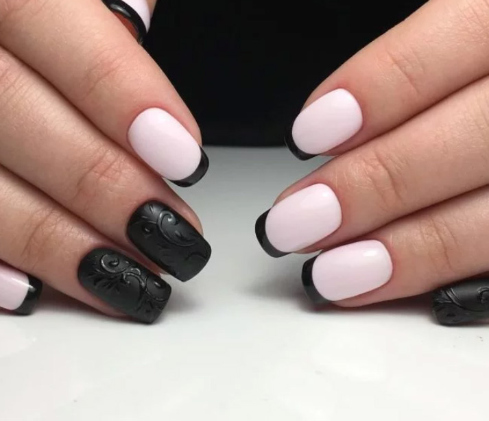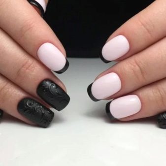 - With black. Depending on the pattern and ornament chosen, the combination may look very gentle, for example, thin twigs with buds, or rather boldly, for example, anime or graffiti-style drawings. To these two colors, without problems, you can mix one more, then you get interesting divorces. But do not do them on all nails.