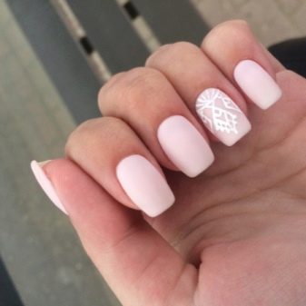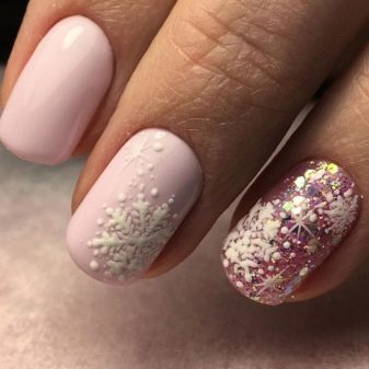 - Winter. Frosty patterns, snowflakes and rhinestones can be depicted not only on blue, red and blue nails. Try to put them on a pale pink background. This will emphasize the winter theme, and remind you that there is a lot of bright, joyful and positive in this season too.