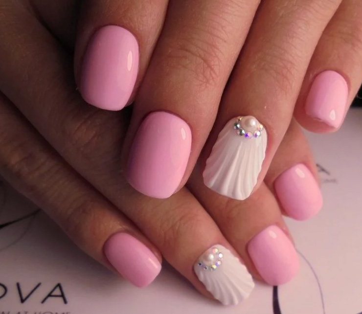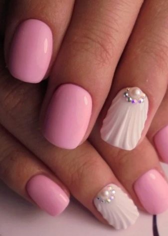 - Shell. Remind about a pleasant sea trip will help a manicure. Master of nails lays on one of the nails this volume sink. If you make all the nails in such a technique, then the effect may be the opposite. Instead of the original and exquisite, you get a tasteless manicure.