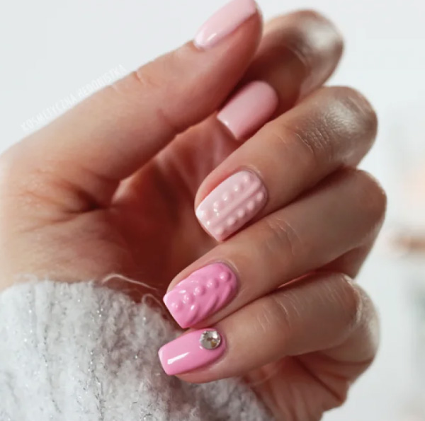 - Voluminous. One option has been described above just now. But he is not the only one. Pink manicure may resemble weaving or knitted product. In addition, a skilled master can place a very original figure or pattern in three-dimensional technique on one nail.
