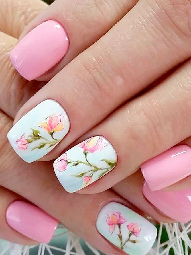 - Spring. Delicate pink shades appear in the spring in the opening buds of the first flowers. This idea can be used for nail design. Watercolor technique will emphasize the specifics of this time of year. Nature is only awakening and the colors are still very blurred, so the gentle stains on the nails will remind you of iridescent streams and drops.