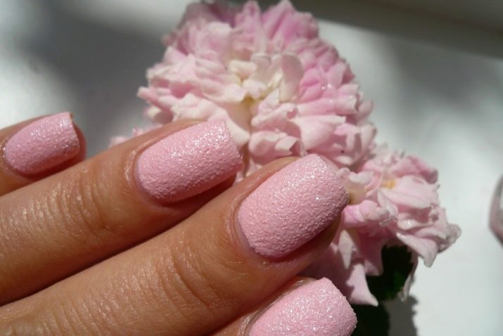Moreover, many people associate pink with sweets, but this impression can be enhanced. Using a special powder, the master covers the nail with small grains of sand. It seems that the pens are covered with sugar.