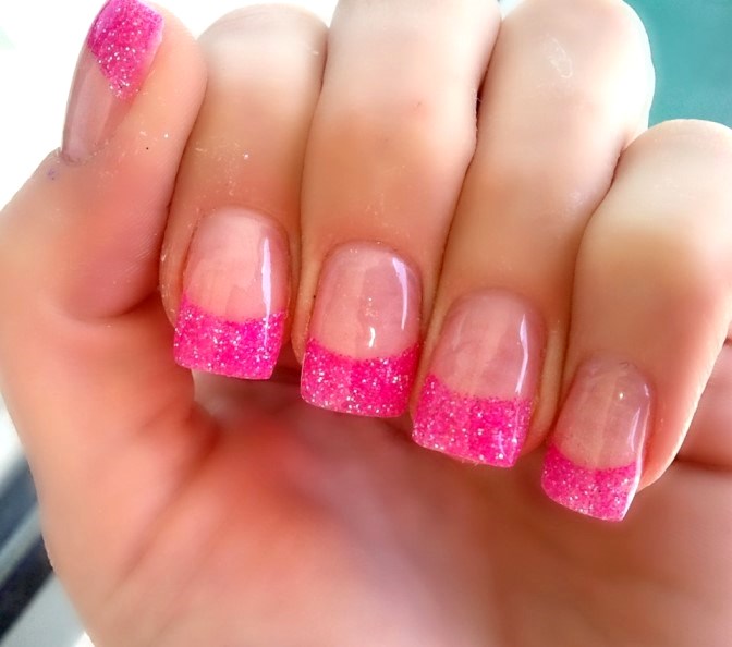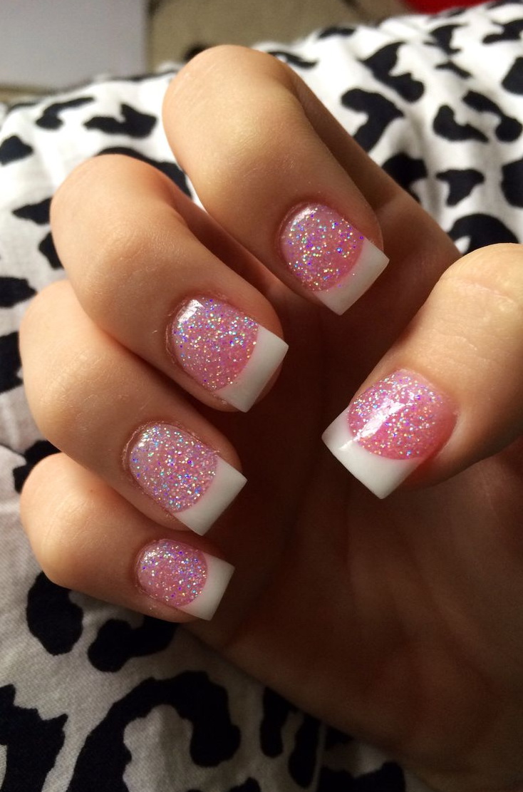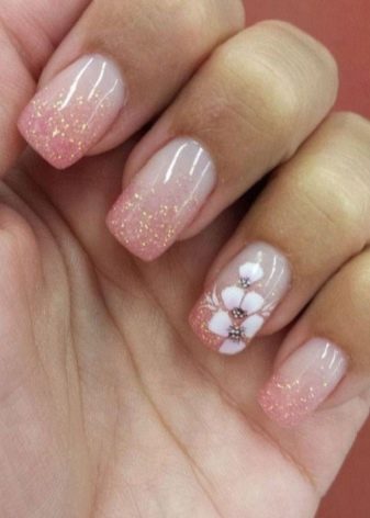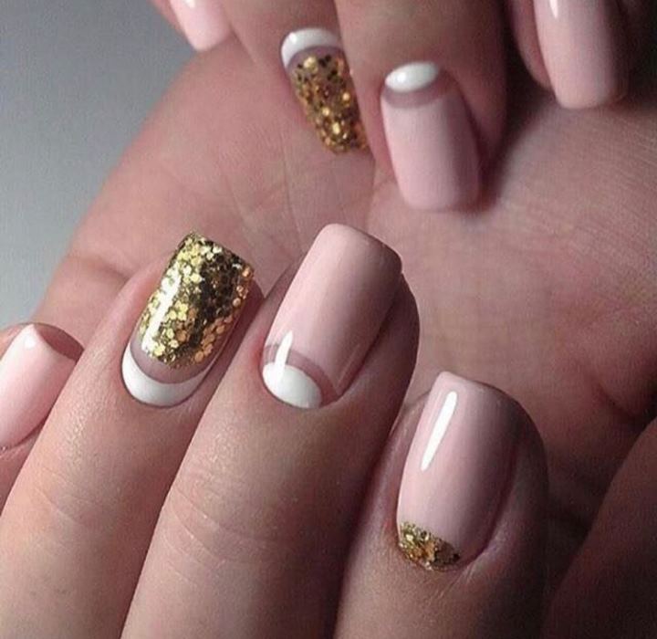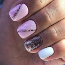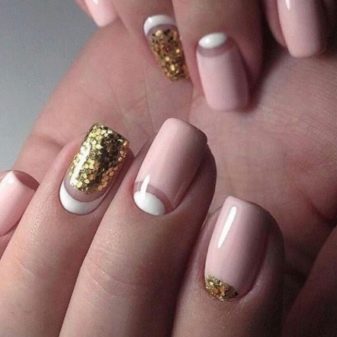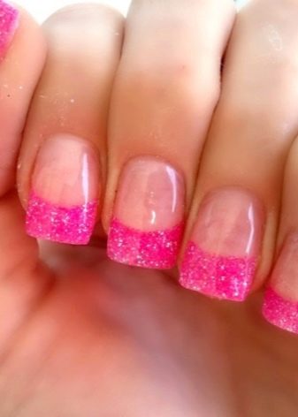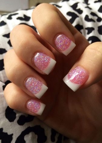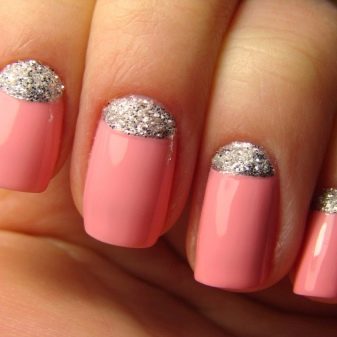 Such a manicure is often used in combination with sparkles, which are located on the regrown part of the nail. For such a design, you can choose a pink lacquer of any shade. Two rows of sparkles of different colors look beautiful.