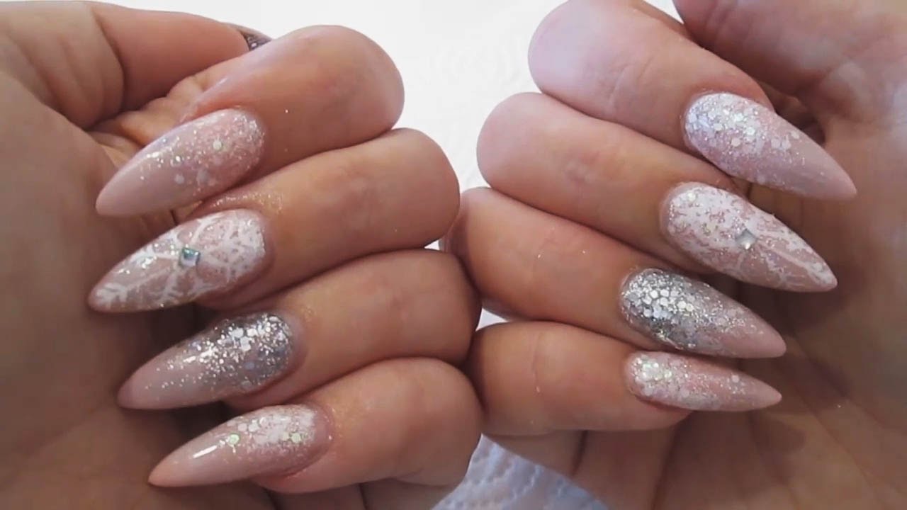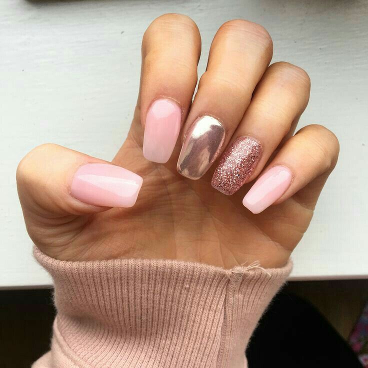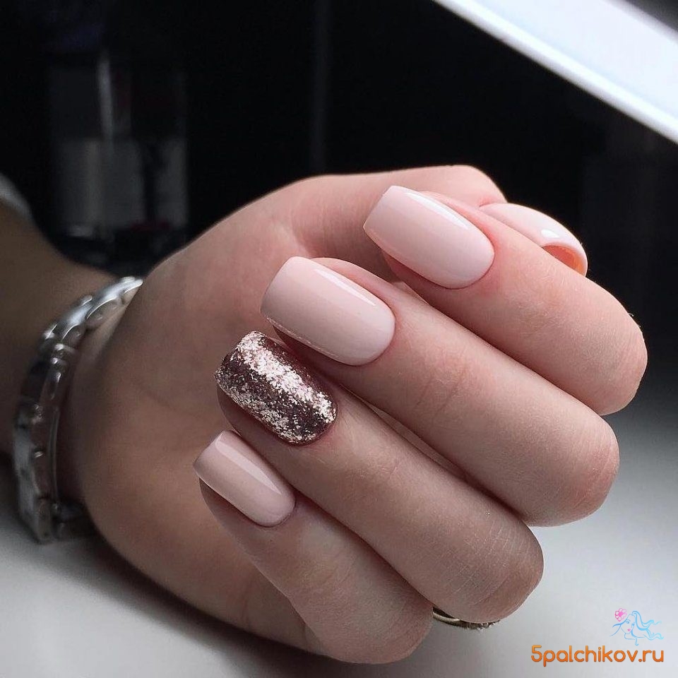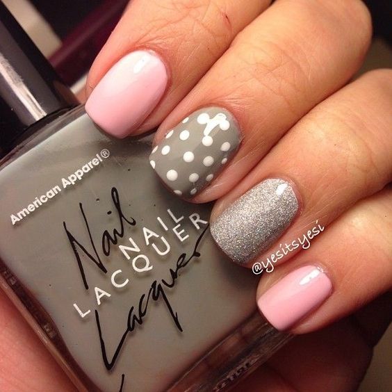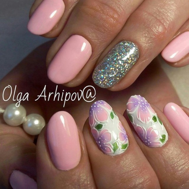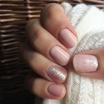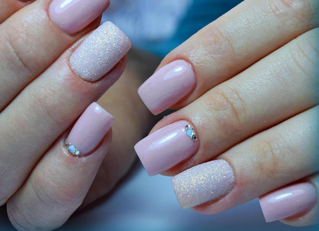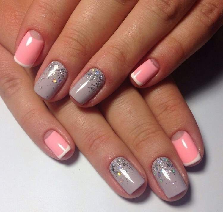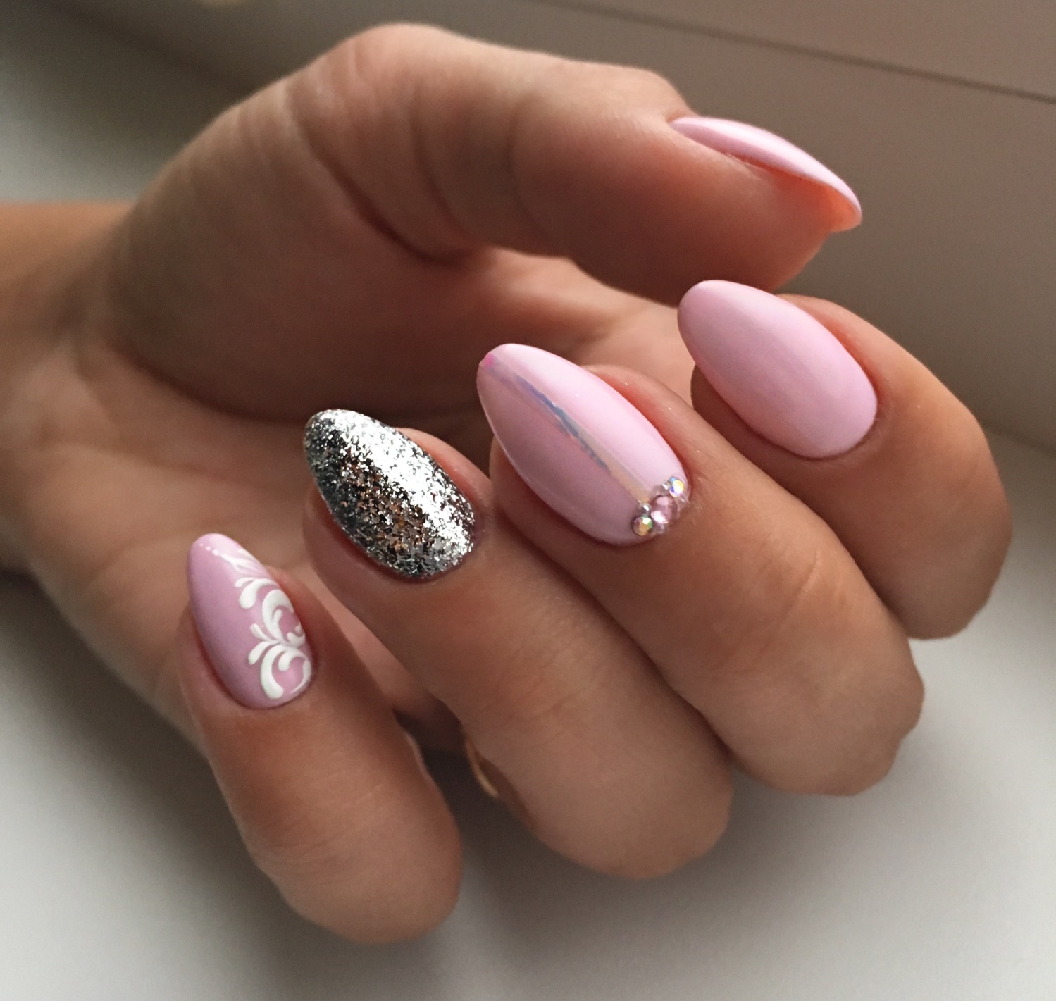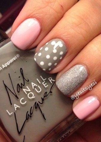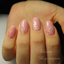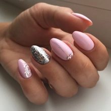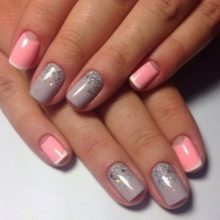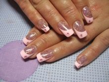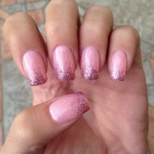 On the nails of medium length it will be advantageous to look design in a gray-pink tones with sparkles. For long nails, you can choose the ash-pink version. Ash is achieved by mixing with glitter.