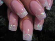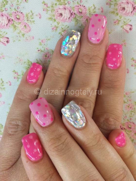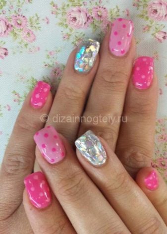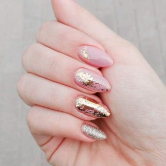 Pink manicure with the use of foil looks impressive. It can cover the nail completely or arrange the pieces of different colors in any order. Admiration causes the addition of stained glass, mirror fragments.