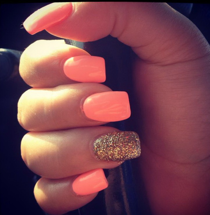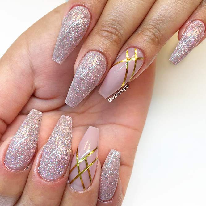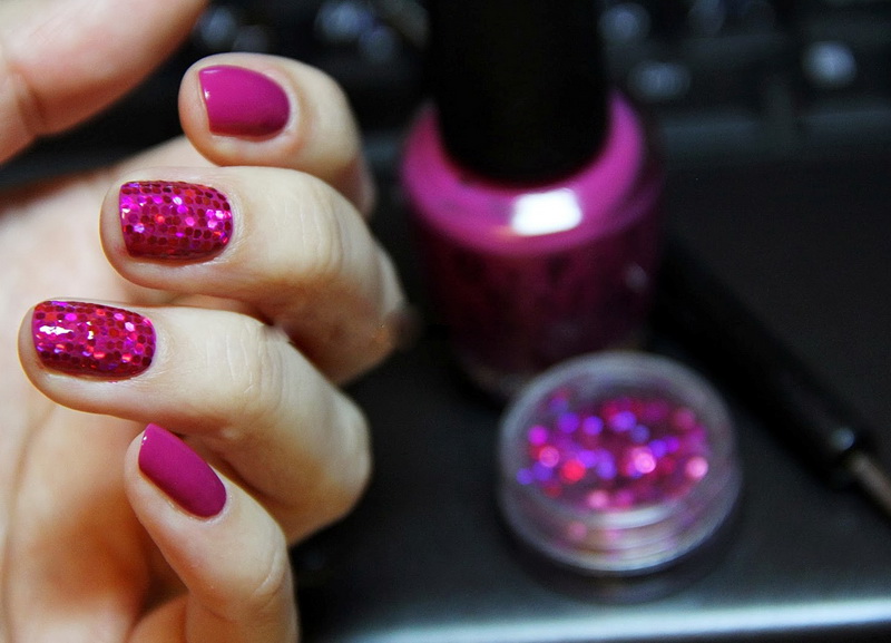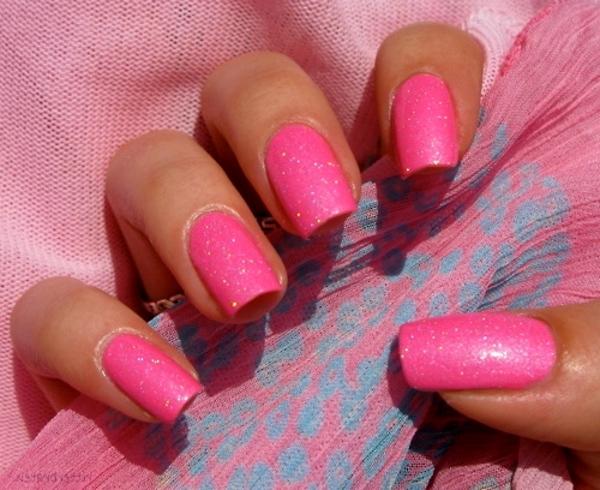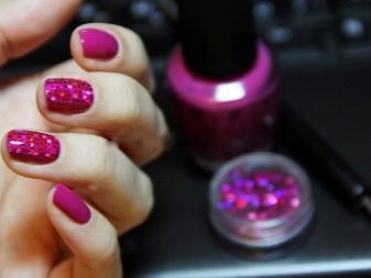 Glitter is often used in manicure. It is a variety of shimmering metallic foil particles. Particles can vary in shape and size.