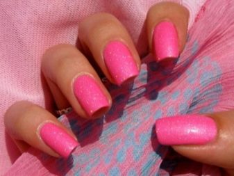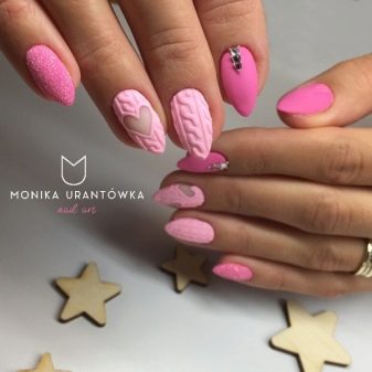 Knitted manicure will be relevant for the winter season. Often this technique is used for New Year's parties. Also on a pink basis, you can use sparkles that mimic velvet sand, starry sky, sugar grains, etc.
