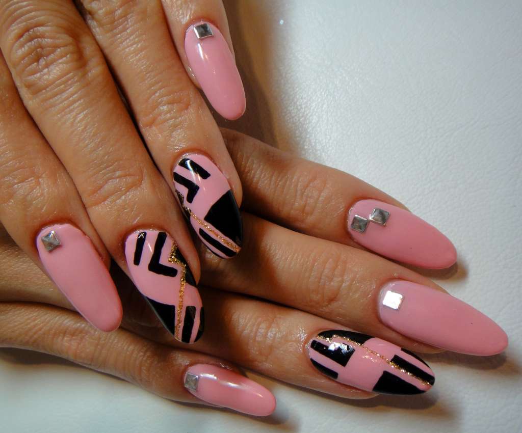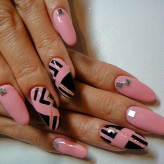 Also pink lacquer is often combined with other colors. The combination of black and pink will look original. Most often, you can find a marigold with a pink base, on which is located black lace. You can also draw a black border on the end of the nail plate, add a slanting strip of any thickness.
