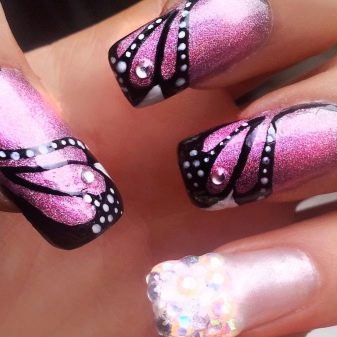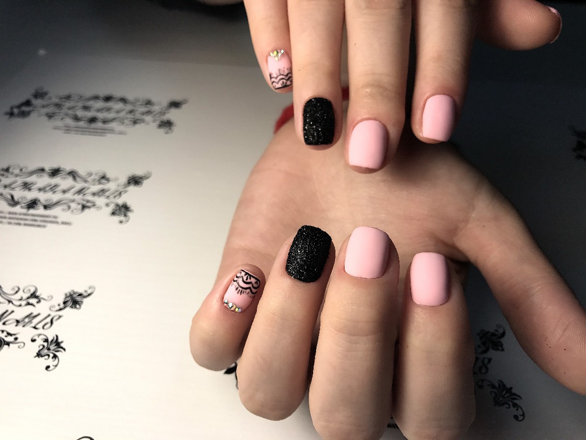 Matte design in black and pink colors will look original in combination with small rhinestones.