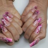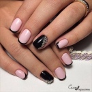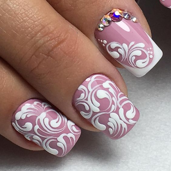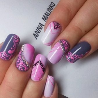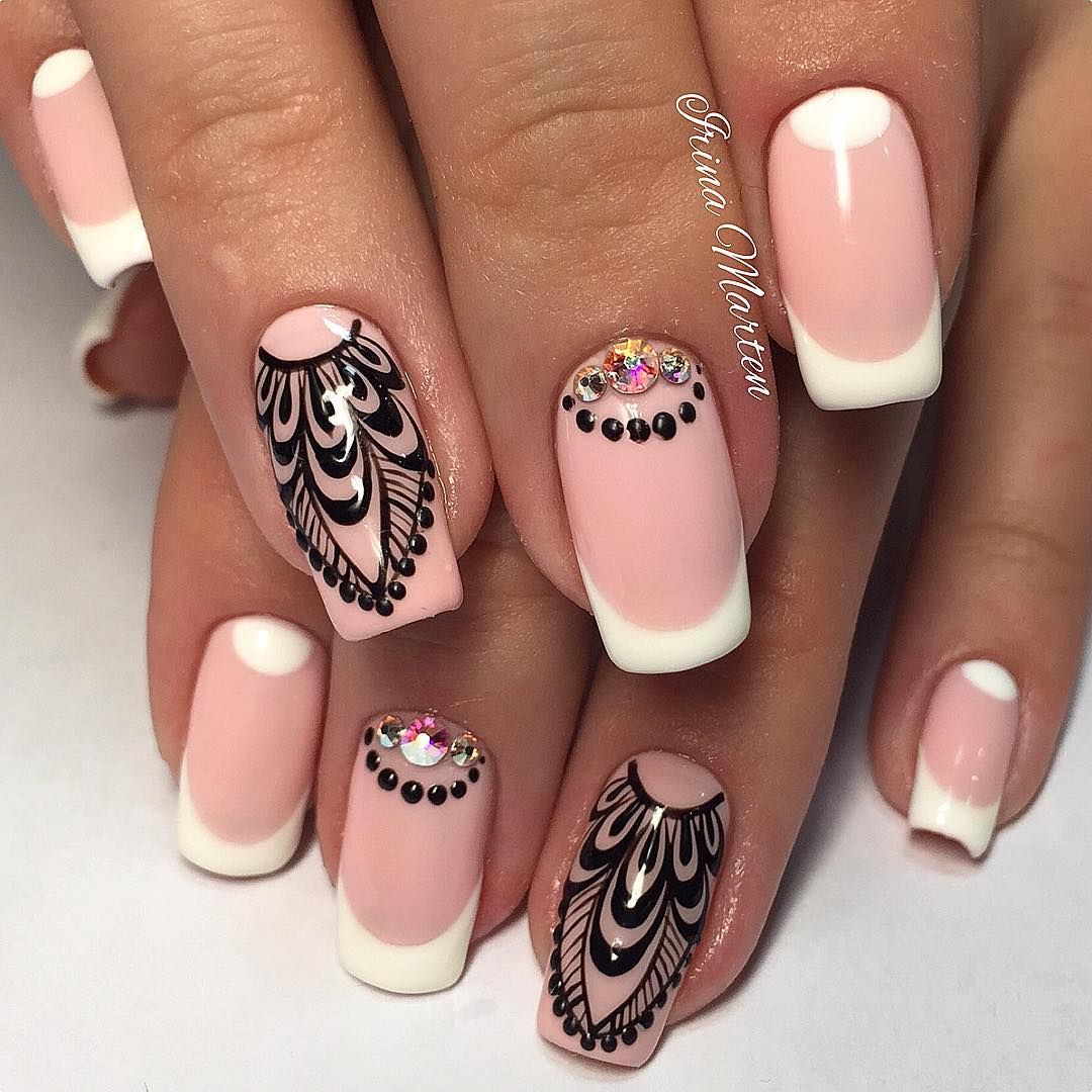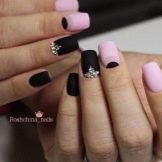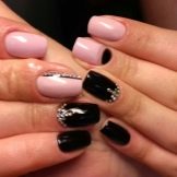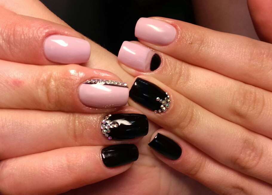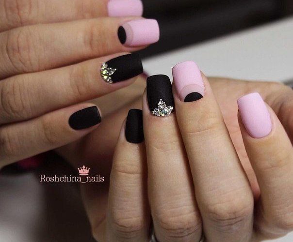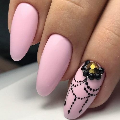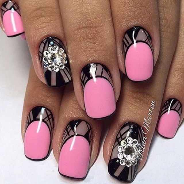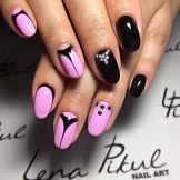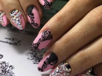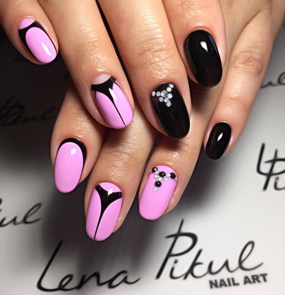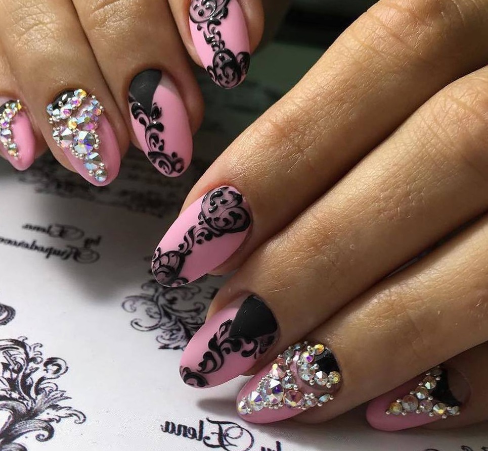 Gentle pink and harsh black colors together create an excellent tandem. Prefer muted pink tones. Delicate delicate patterns, complemented by several rhinestones, only emphasize its elegance. Absolutely inappropriate here will look heavy geometry or gothic patterns.