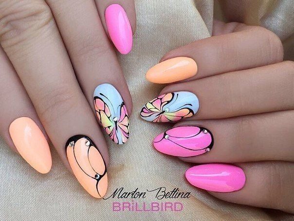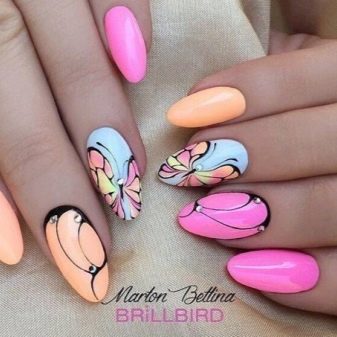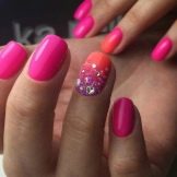 At first glance it seems that such a combination is redundant, but with a skillful combination such a manicure looks very gentle and beautiful. Make such a bright focus on only one or two fingers - leave the rest in a calm monophonic scale.