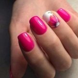The main feature of any pink manicure is the abundance of shades of this color. They can be both very gentle, and bright, juicy. Therefore, speaking of pink, each represents its own tone - the unity and universality is not discussed here. For example, bright pink color is more suitable for girls and teenagers, and the elegant color of tea rose will decorate the image of any business lady.