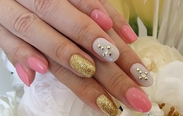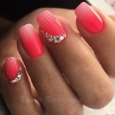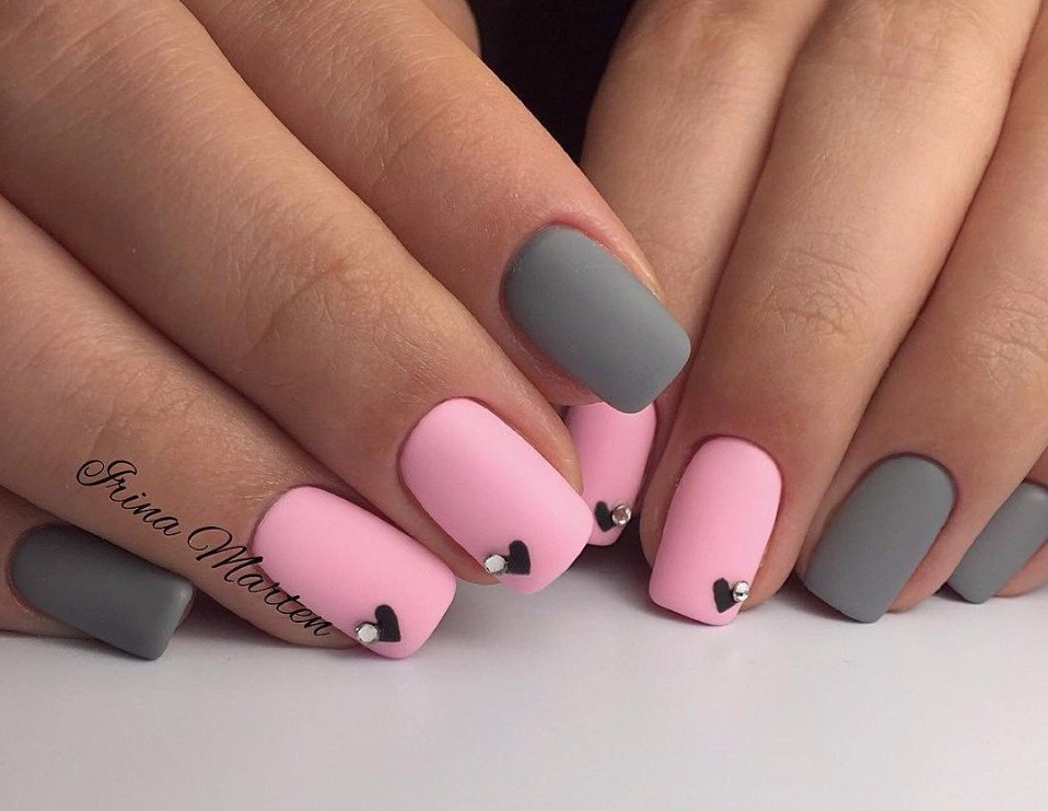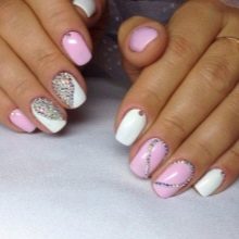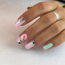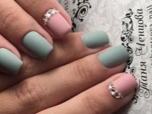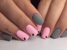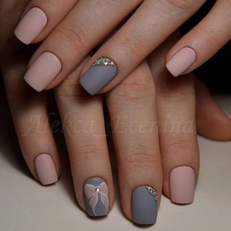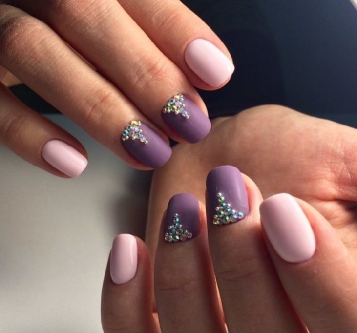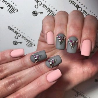 An interesting version of manicure. On the one hand, gray color gives peace and nobility, on the other hand, rhinestones give restrained chic. You can use the latter as accents. The combination of colors can also appear in the drawings, and in the coloring of different nails with these shades.