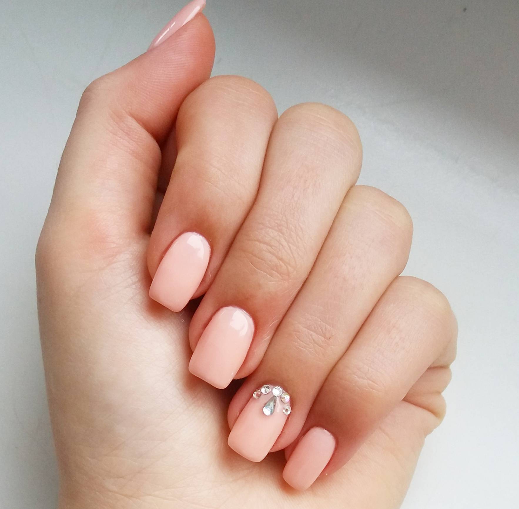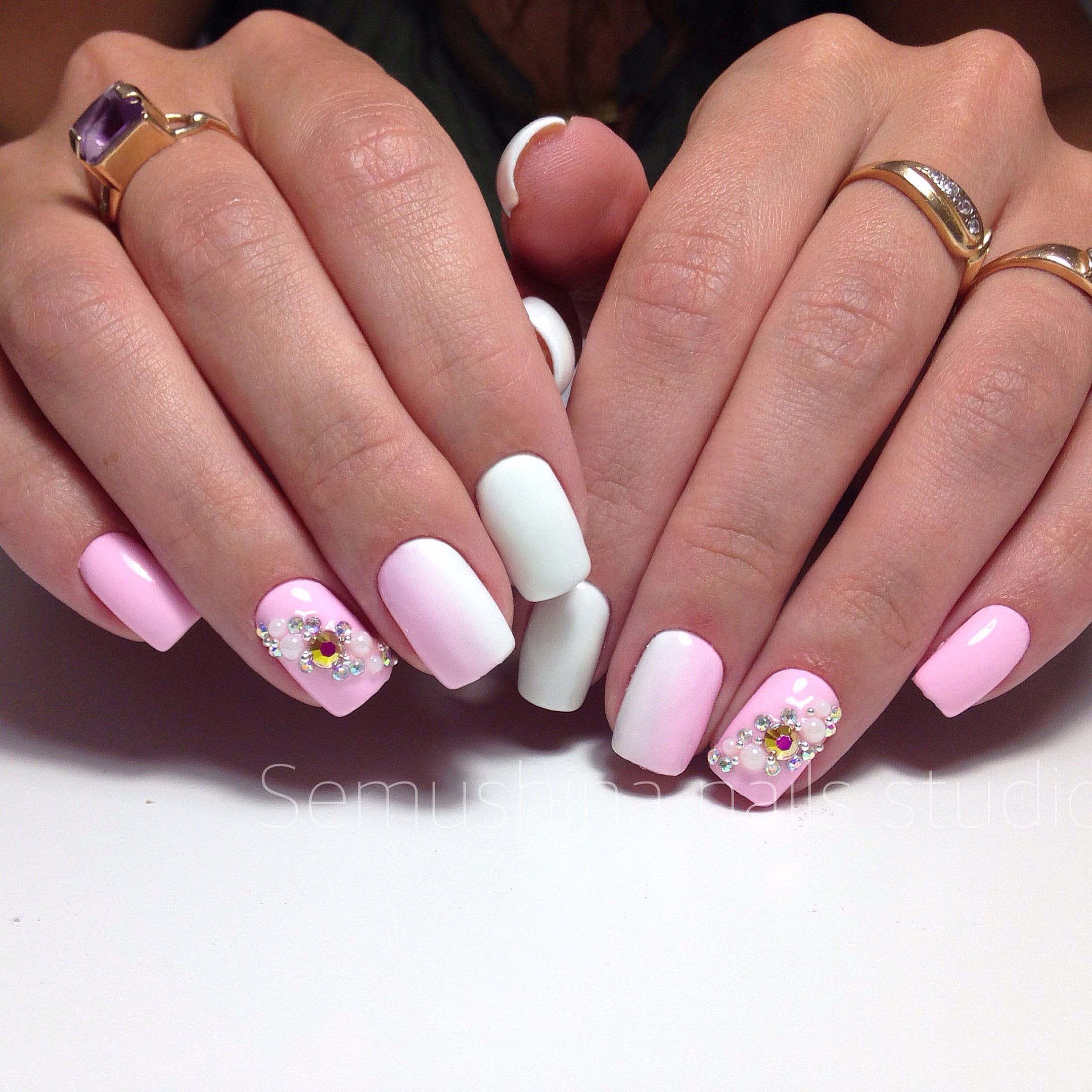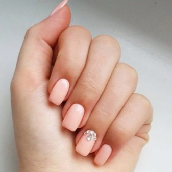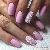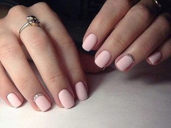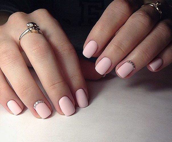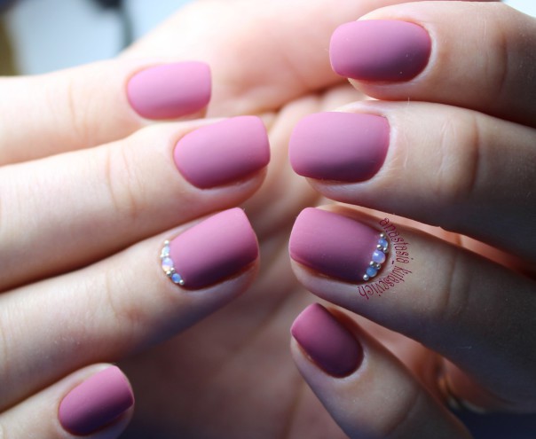 Matte pink manicure with rhinestones.