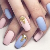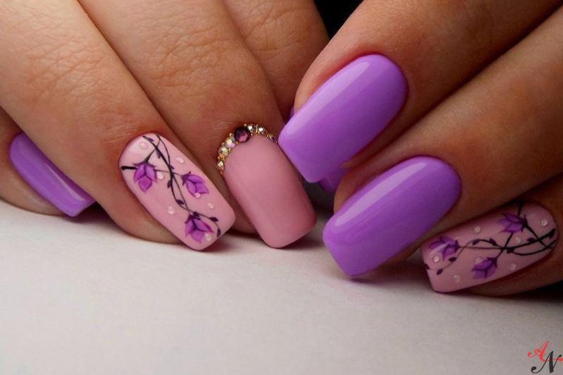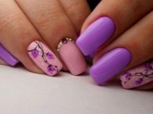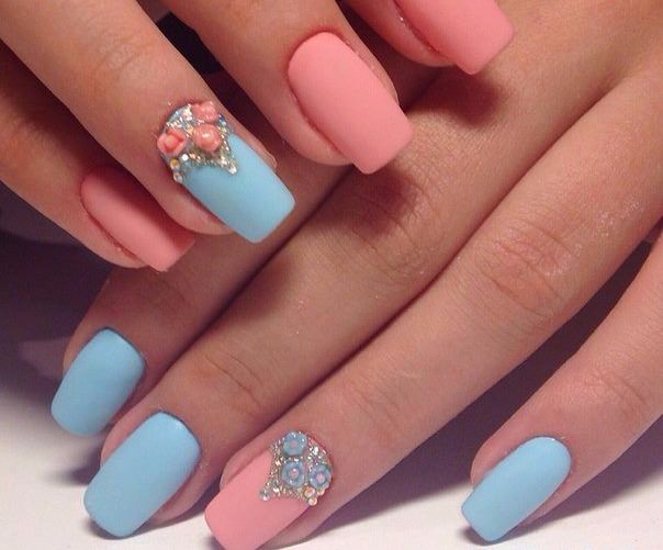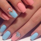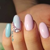 A delicate combination of blue and pink flowers looks very harmonious. Although these tones from a different palette, but with a successful selection of shades, you can create an interesting duet.You can paint one finger in blue, and the rest - in pink. At the same time, the strasics can be located both on this blue nail and as accents on others.