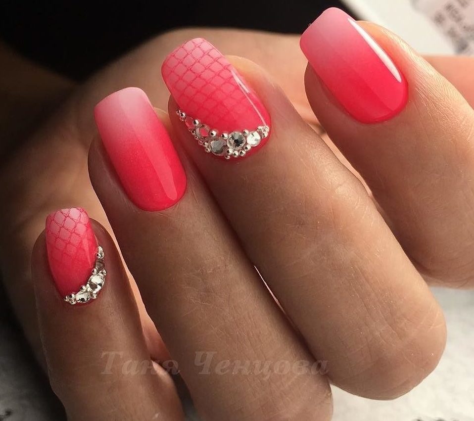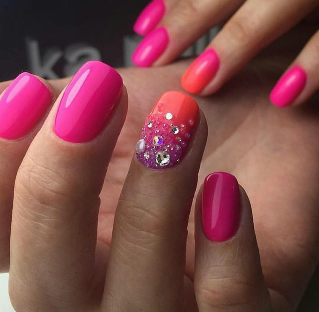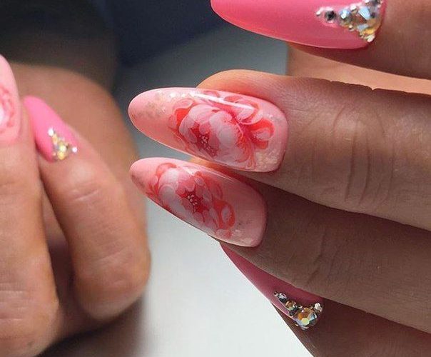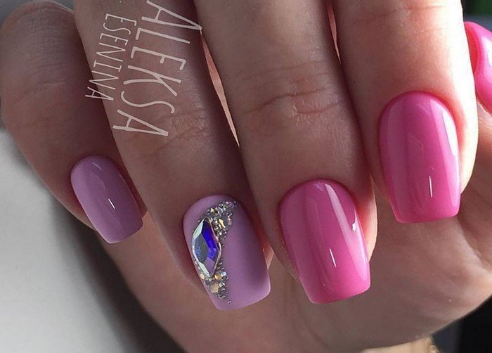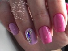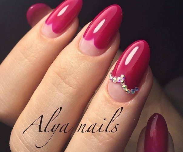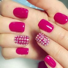 This passionate deep color gives a pink manicure with rhinestones brightness and chic. The combination is more suitable for summer manicure. When using complex designs and techniques, long nail plates are required, since short nails may overload such a design.