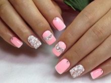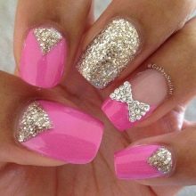 Bows and rhinestones on a pink background - a combination for young women. They still live romantic dreams, pure and naive. This version of the manicure fully emphasizes this. But it’s hard to imagine a “business shark” with a frivolous bow on its finger.