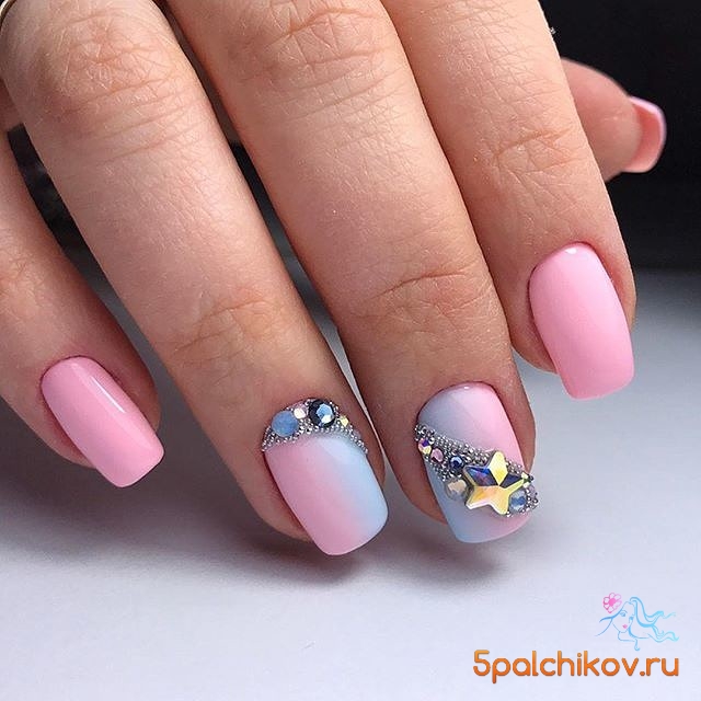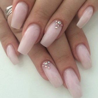 Despite the fact that the manicure in the ombre technique already looks quite independently, it is not forbidden to supplement it with stones. There can be several variants of execution: choose only one or two marigolds, make a smooth color transition on them, decorate with rhinestones or use a gradient on all fingers, but stick the pebbles on only one.