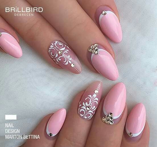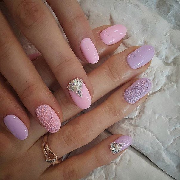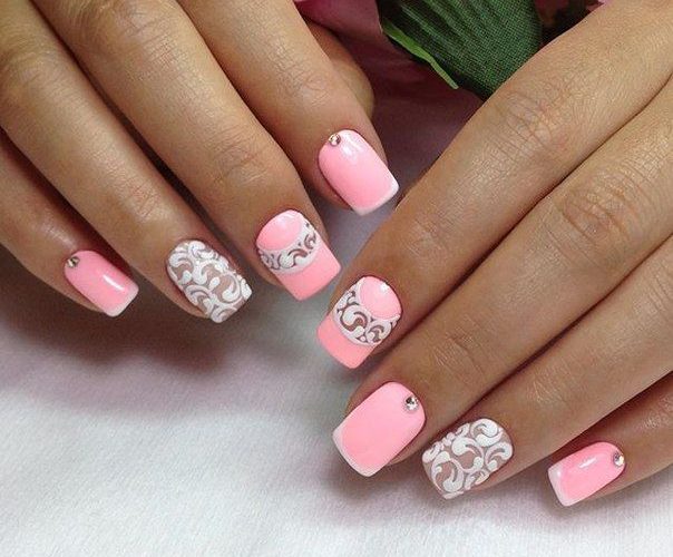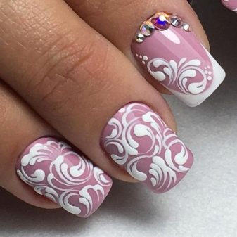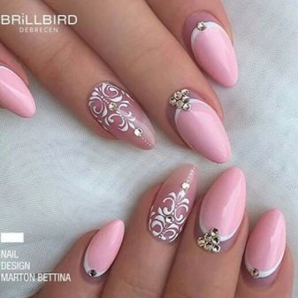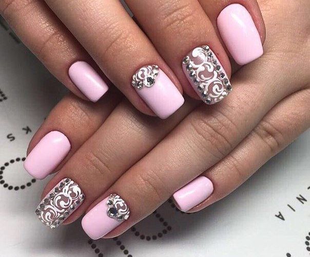 Pink manicure with lace patterns and rhinestones is the embodiment of tenderness and romance. It can hardly be called restrained and strict, so choose for it aerial flying fabrics and pastel shades. More suitable for spring and summer.