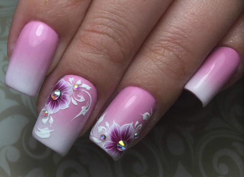 Flowers made in watercolor (or water way) technique look very gently on a pink background. If you want a brighter effect, then ask to draw a bright rose. Rhinestones that complement the flower will resemble dew drops and draw attention to the pattern.