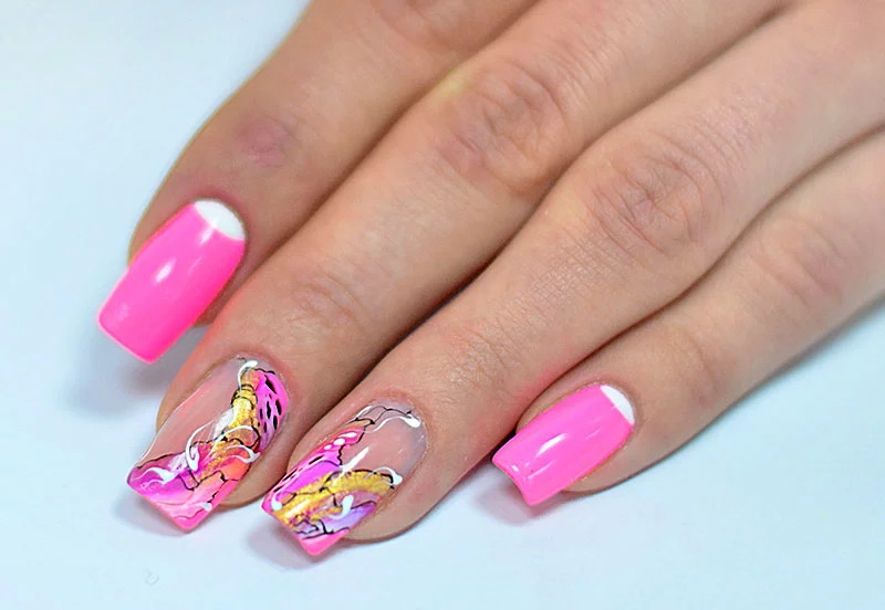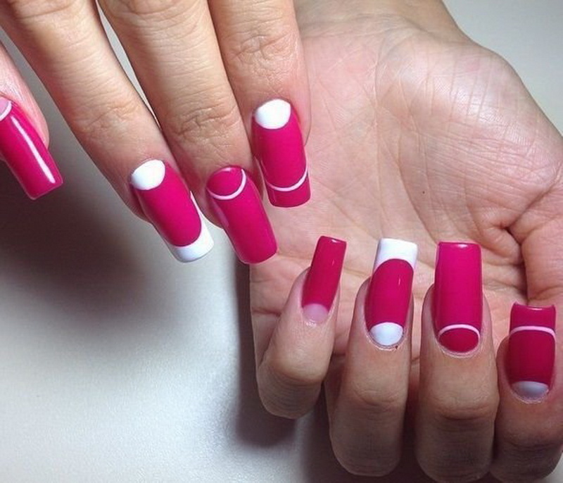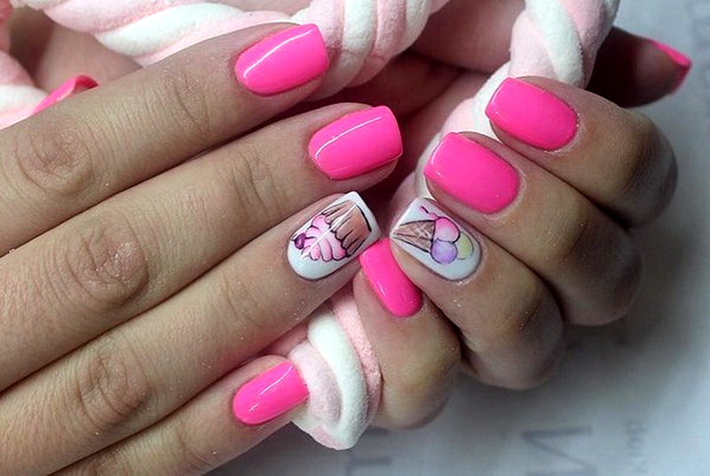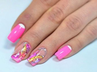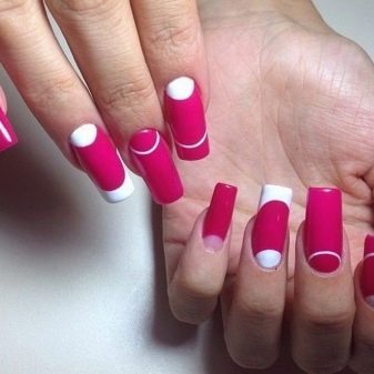 For the acid-pink manicure, the best solution would be the topic of geometry. The decor of kamifubuki, as well as floral themes and ethnic ornaments will be suitable for him. It is possible to carry out dressing on the basis of a French, gradient. Designed for such tones and design with holes, stamping and stickers. The theme of prints can be both lacy and geometric, and fruit. Although such solutions are not suitable for the image of a business woman and office worker, they will decorate the scandalous fashionistas with a bow.