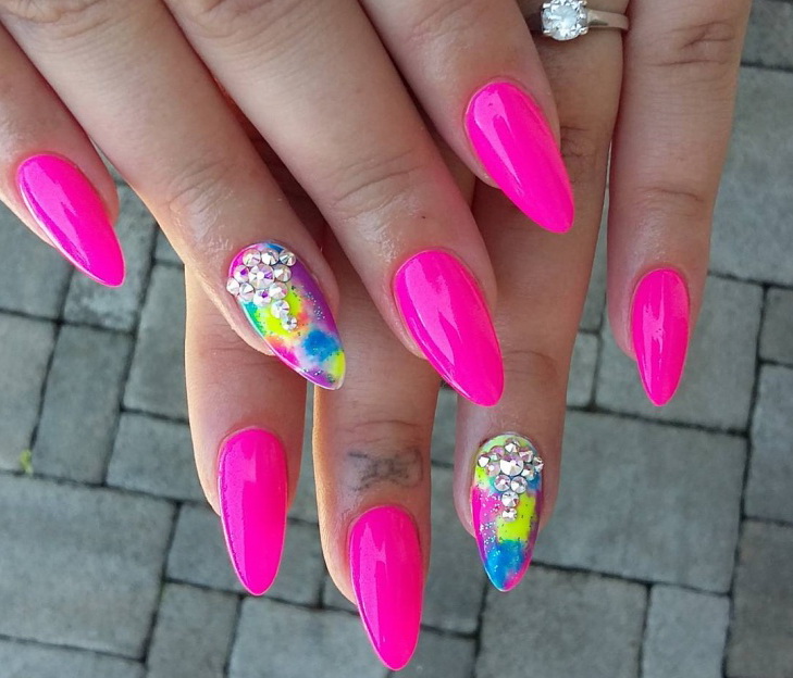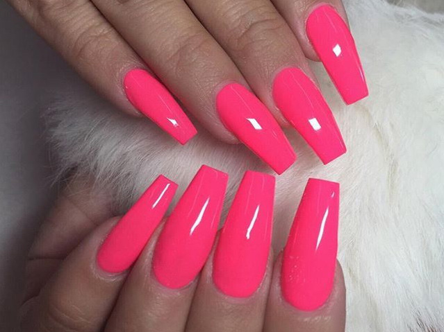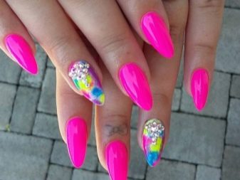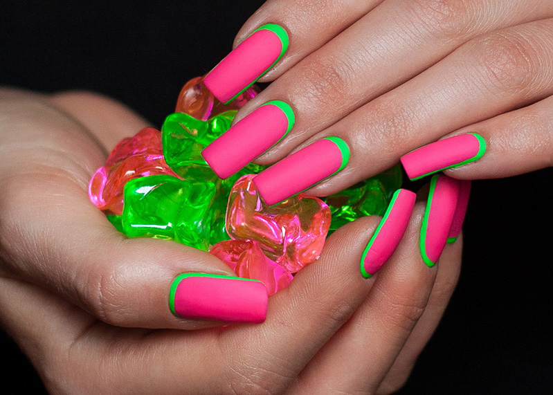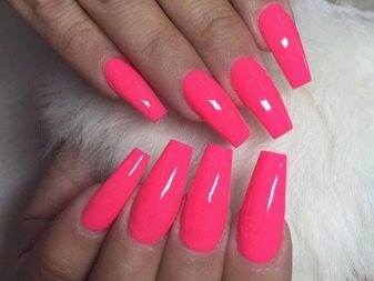 For example, sharp tones are incompatible with everyday images, because the task of such a manicure is not so much to complement a discreet bow as to single out a woman from the crowd. Neon shades literally scream about themselves, forcing those around them to pay attention to their unusualness. Neon pink can not be called a tone of tenderness. Rather, it is a protest connotation, which declares itself in a rather harsh manner.