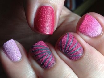 The method of creating a design of caprone with the use of bright pink gel polish allows you to give a rich tone of lightness and great aesthetic appeal. In combination with contrasting surfaces and skillfully selected pattern of voilev technology, the effect of such a design will attract the enthusiastic views of others.