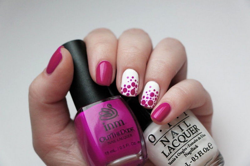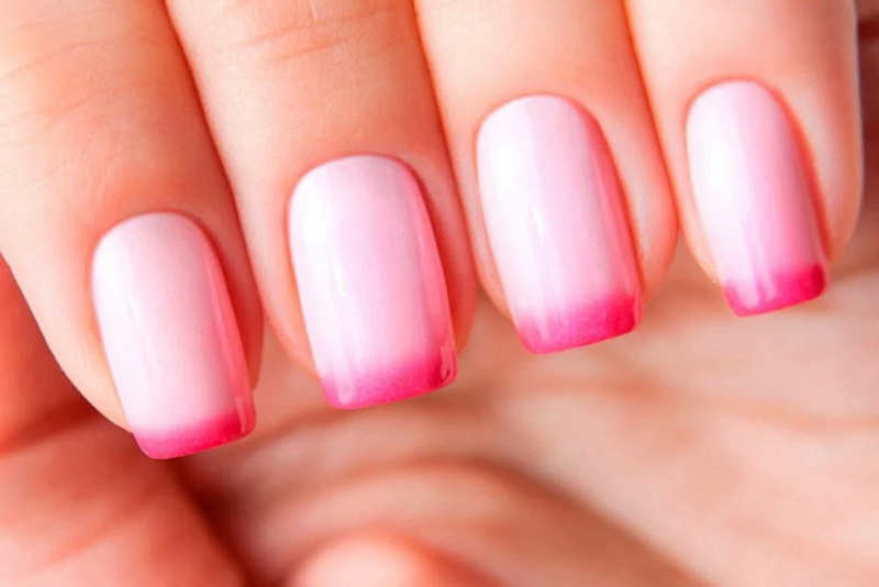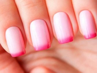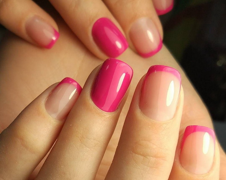 This design allows you to soften the perception of bright pink pigment. It can be made with a smooth stretching from bright pink to white, as well as the design using related colors. Today's gradient can be not only traditional (from the bottom to the top edge), but also with a stretch between the side rollers and the diagonal technique.