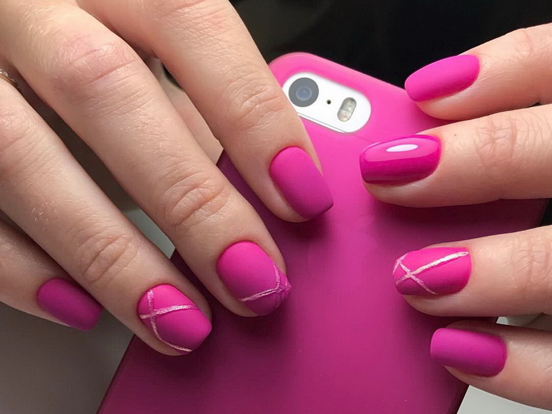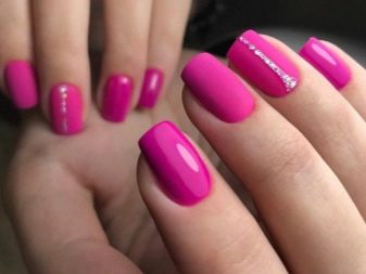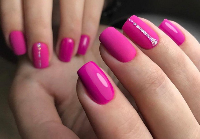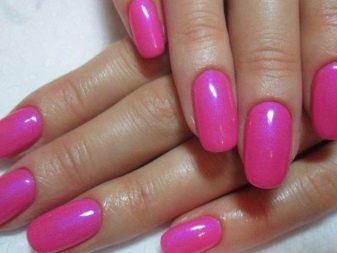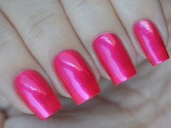 Of these, the most pigmented tones, allowing to make a juicy and bright pink manicure, can be called matte and glossy options. This is an excellent base for decoration, as well as creating an unusual effect. Of the matt varieties of today, more elegant nail products are pigments with velvet, velor, velvety and satin texture. Besides them, the favorites of the design are mirror, magnetic and chameleon varnishes.