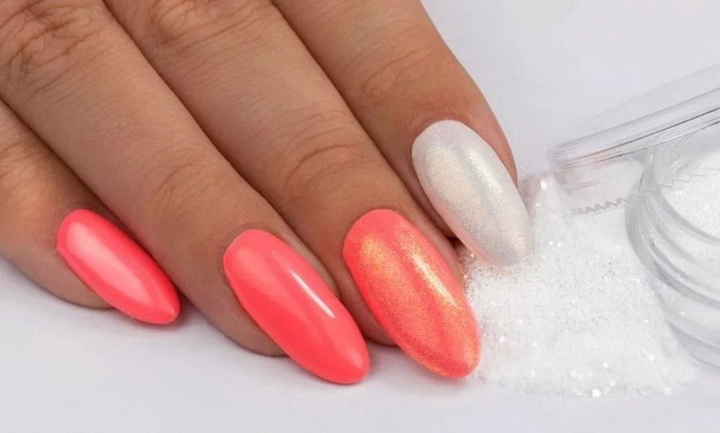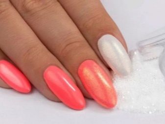 Acrylic powder with the smallest particles will allow you to add a nobility in a bright pink manicure. In contrast to the rubbing, it is sprinkled on the surface of the undried finish, and then thoroughly dried so that the coating does not crumble. Powder today it is customary to create a relief decoration of the nails, which is important for pink and helps to give it harmony.