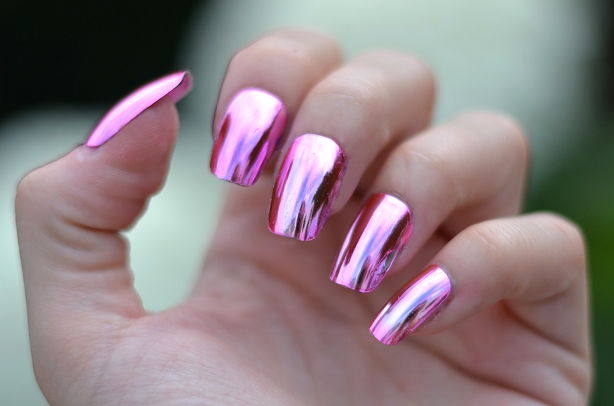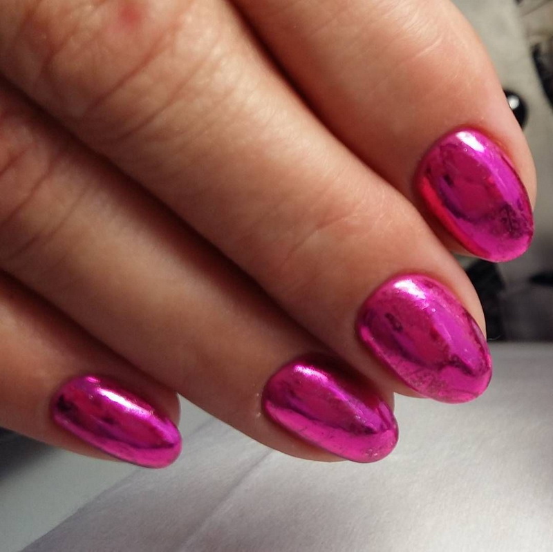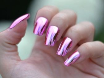 Mirror coatings allow you to create a trend design.Moreover, such pigments can be used for all nails of the hands, as well as to emphasize the manicure. Create a coating with the effect of metal or a mirror can be and with the help of special powder rubbed. Glowing varieties in natural light seem ordinary, but in the dark resemble neon counterparts.