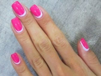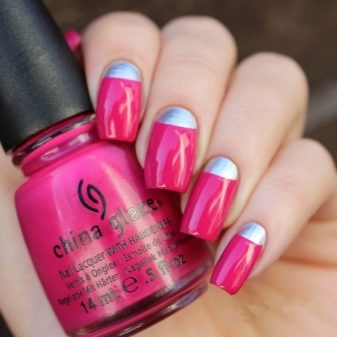 This design has a smile at the bottom of the nail plate. Today, it tends to reduce the thickness, so it often looks like a thin stroke of the nail. Such a manicure complemented with gold or silver looks great. In this case, the texture of the pigment can be both glossy and matte.