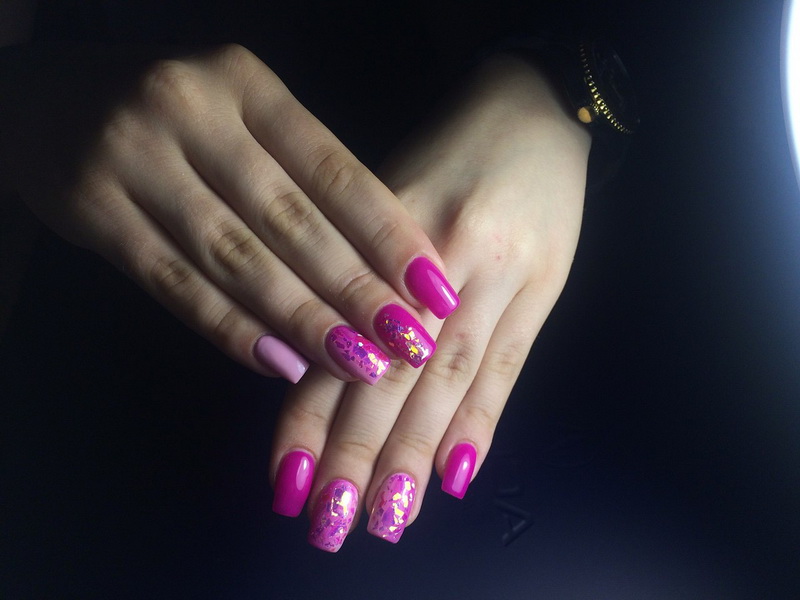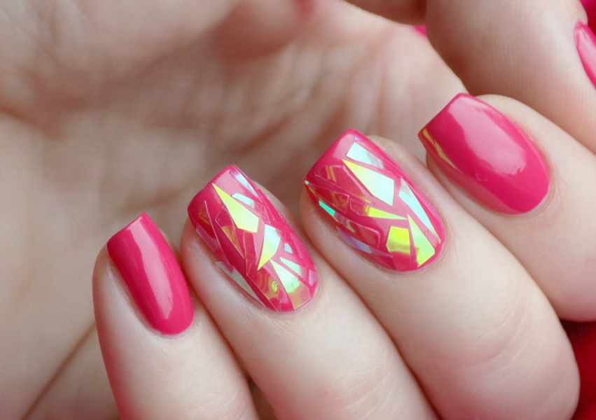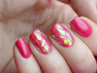 This technology is today considered one of the most sought after in pink. Due to the film, forming the effect of the broken glass, you can add stylish accents to the design. Such a manicure will not go unnoticed. And since it is considered to be ultrafashionable today, even the bright tone of the base will be perceived more naturally.