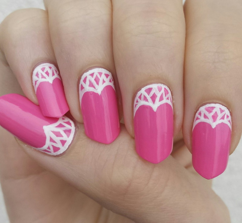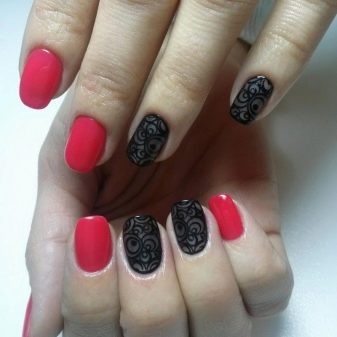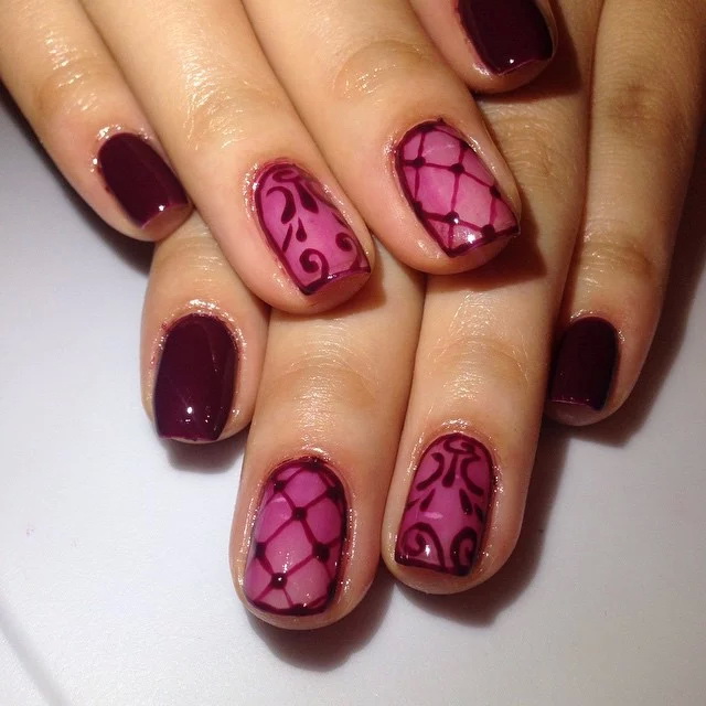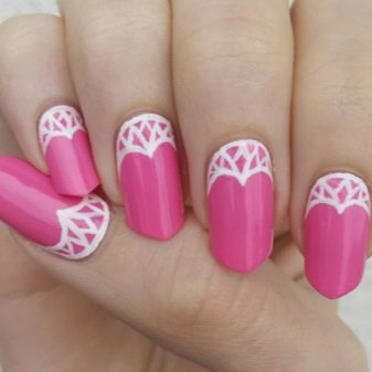 - You can change the monochrome design by hand painting. Decorating two nails with ten lace holes on a bright pink background, you can get a royal manicure.